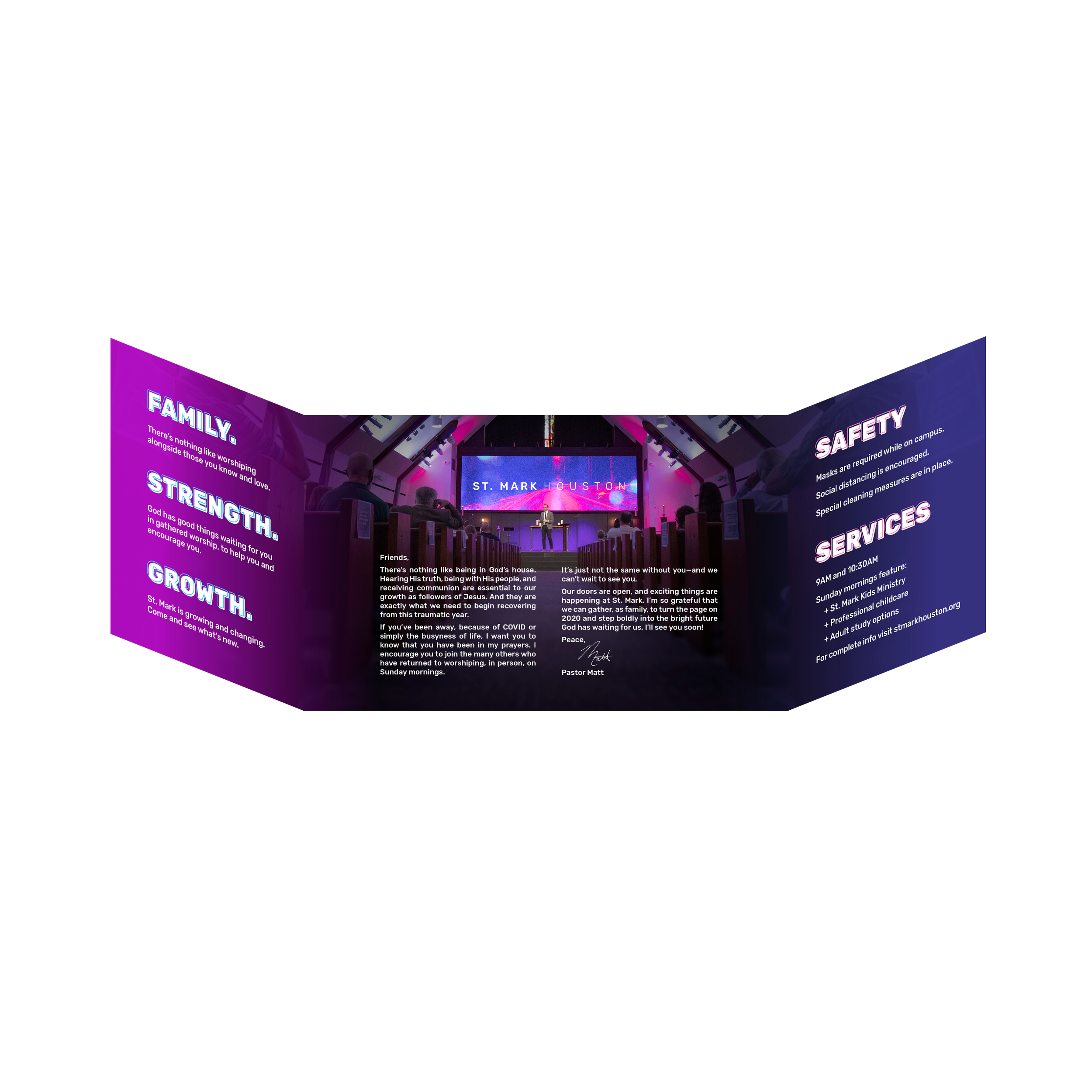 When the world shut down due to Covid, St. Mark Houston had just begun a $2 million dollar renovation to the Sanctuary, complete with all new technology including a 30-foot LED wall. As restrictions were lifted, we wanted to create a mailer to invite people back to church and show off the updated digs. I chose to do a gate-fold mailer to mimic the doors leading into the renovated space.